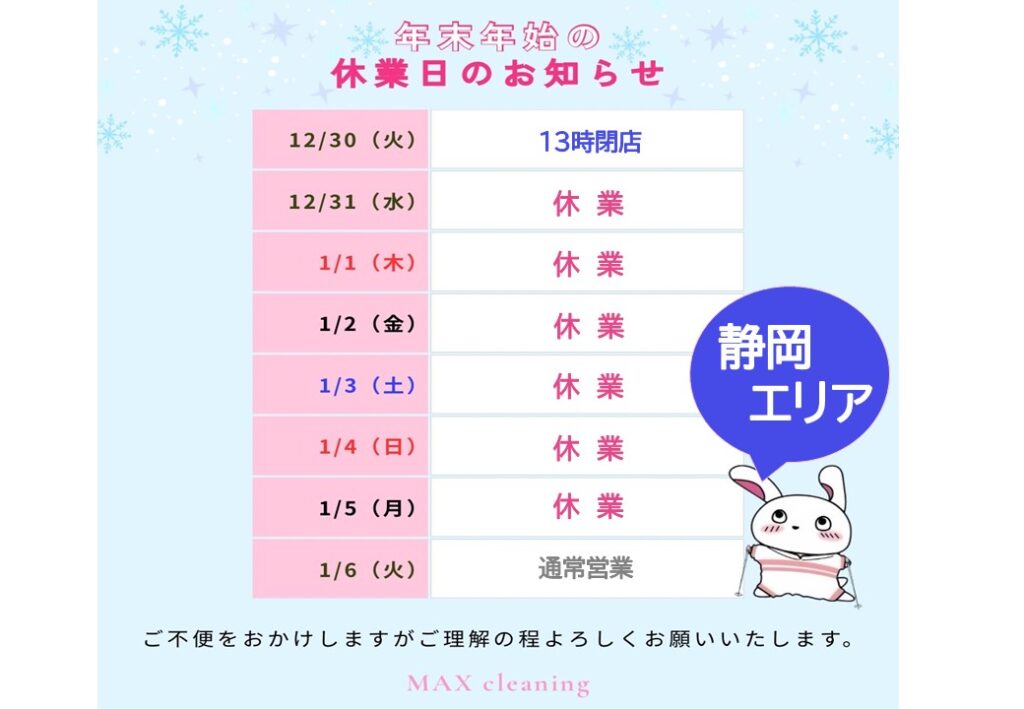 *静岡エリア 年末年始の休業日のお知らせ*